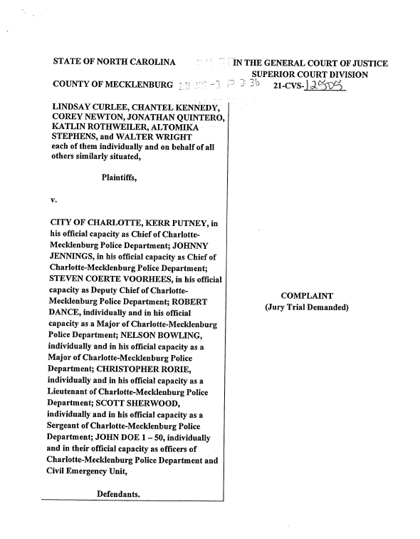 COERTE VOORHEES, in his official capacity as Deputy Chief of Charlotte-Mecklenburg Police Department; ROBERT DANCE, individually and in his official capacity as a Major of Charlotte-Mecklenburg Police Department; NELSON BOWLING, individually and in his official capacity as a Major of Charlotte-Mecklenburg Police Department; CHRISTOPHER RORIE, individually and in his official capacity as a Lieutenant of Charlotte-Mecklenburg Police Department; SCOTT SHERWOOD, individually and in his official capacity as a Sergeant of Charlotte-Mecklenburg Police Department; JOHN DOE 1 – 50, individually and in their official capacity as officers of Charlotte-Mecklenburg Police Department and Civil Emergency Unit, Defendants.